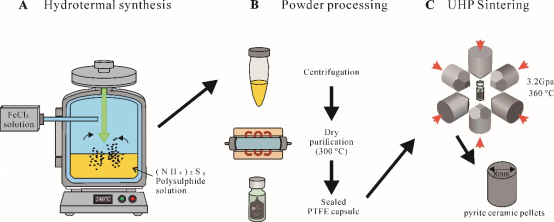 针对这一挑战,胡瑞忠研究员团队独辟蹊径,将水热前驱体合成与低温超高压烧结两大技术有机结合,实现了前驱体形成与致密化过程的“解耦”(图1)。首先,通过高温高压反应釜精确控制前驱体的成核与生长,获得化学计量比可控、粒径均一的纳米晶黄铁矿粉末;其次,在氩气手套箱中对粉末进行严格干燥与封装,避免氧化;最后,利用多面顶压机在3.2 GPa、360°C的低温超高压条件下进行快速烧结,在避免热分解和同位素分馏的同时,成功将纳米粉末压制成完全致密、无裂纹、表面抛光性极佳的黄铁矿陶瓷(图1)。